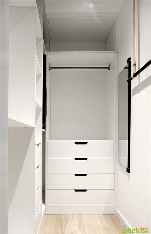 占地2.5㎡的衣帽间,为卧室扩充了更多收纳可能。根据Rebea的需求,在内部做了功能分类的细化设计。除了L型储物柜的部分,还在右边加了一个可以挂放熨干衣服的晾衣杆,和一面可以转动的镜子。