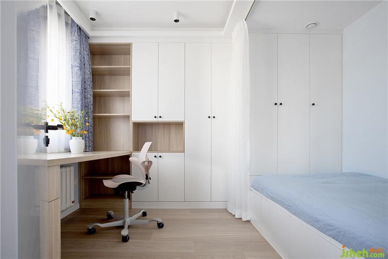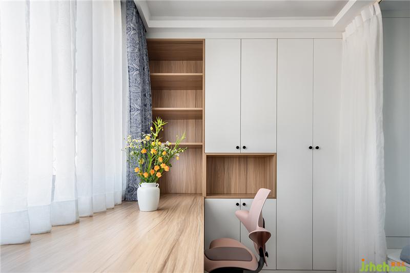 靠窗的学习区,设计了整张工作台,一直延伸到里面的书格,也和旁边的储物柜纵横交错在了一起。桌板的宽度做的稍微大一些,这样就不担心经常让脚踢到暖气。