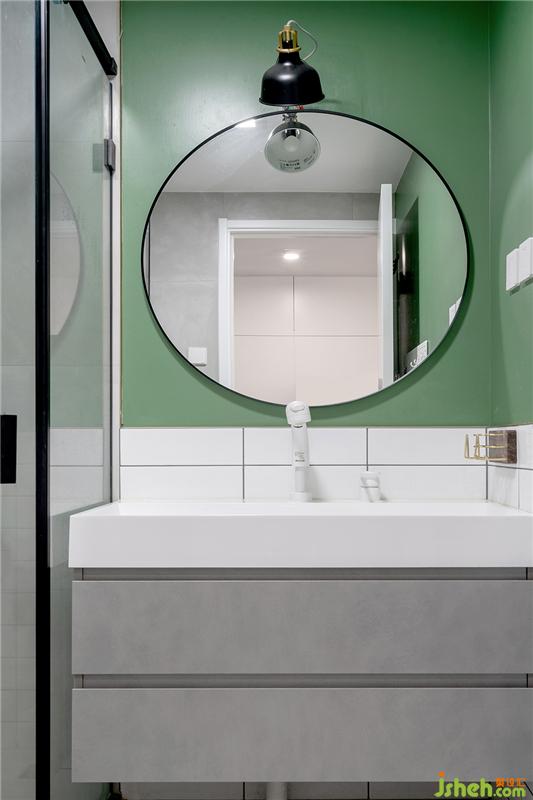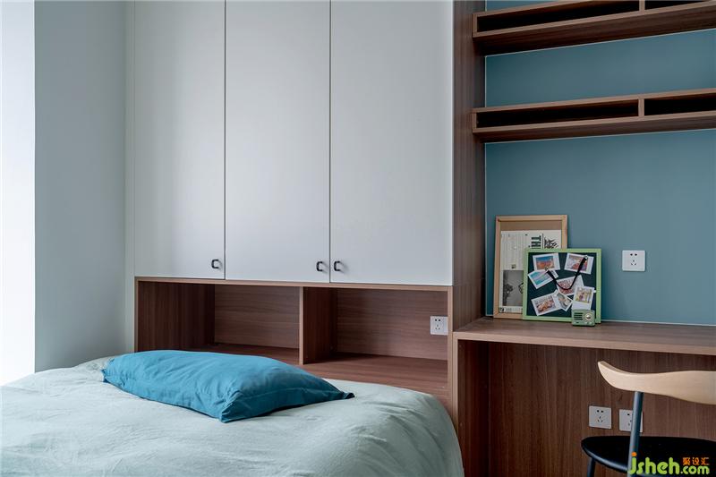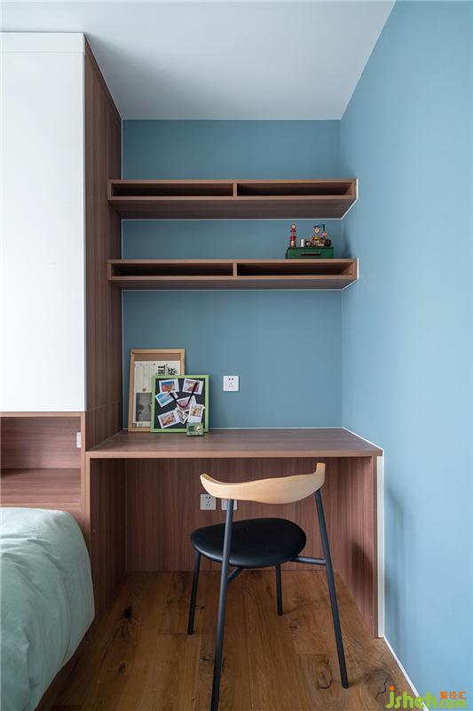 次卧用了点蓝色的漆,配合深色的柜体,也不会显得空间沉闷,以后也可能父母来住这里,所以没有使用大面积深色。