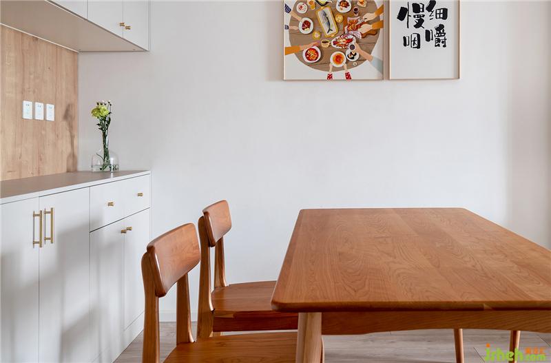 餐厅一角,挂画的图案与文字,表达了一家人其乐融融的生活与饭菜的烟火气,吃饭就是需要细嚼慢咽的态度。