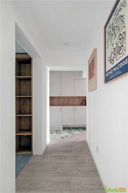 通往次卧的走廊,改变了原来进入厨房的入口。这样厨房门与卫生间门并不正对,也给过道区域预留了足够的装饰墙面。
