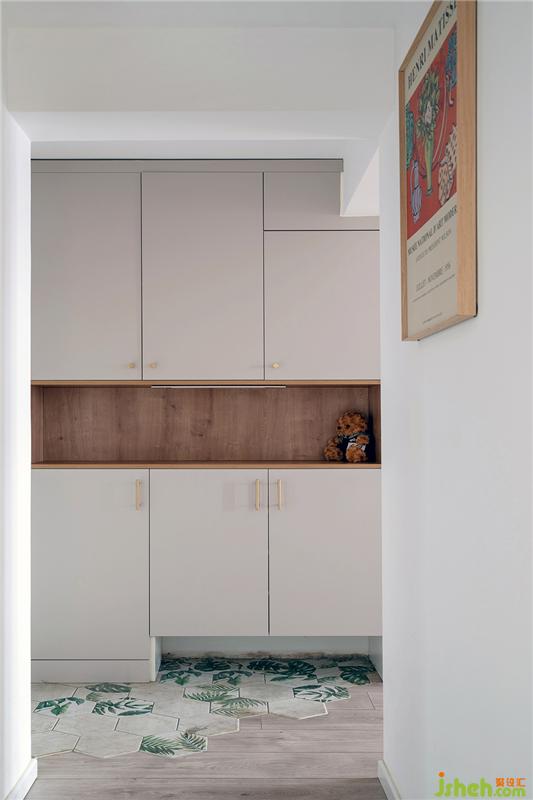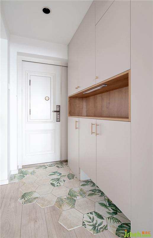 门厅区域,用了部分六角砖与地板做拼接,进门后可以在瓷砖区域更换外穿鞋。