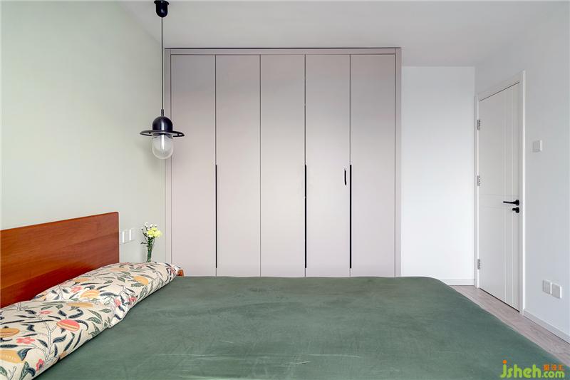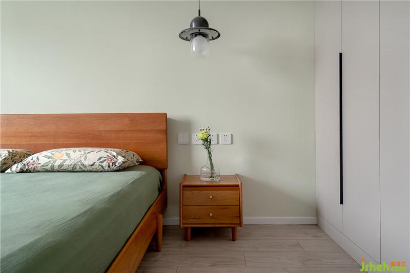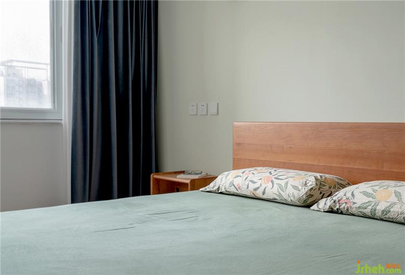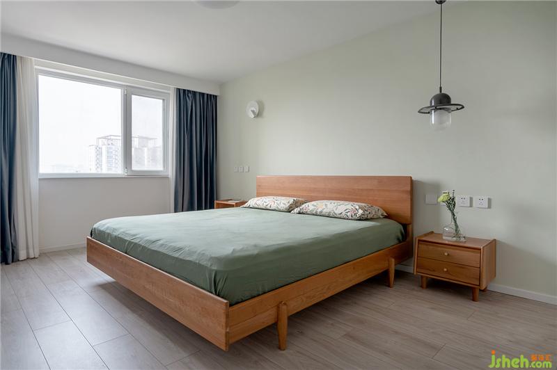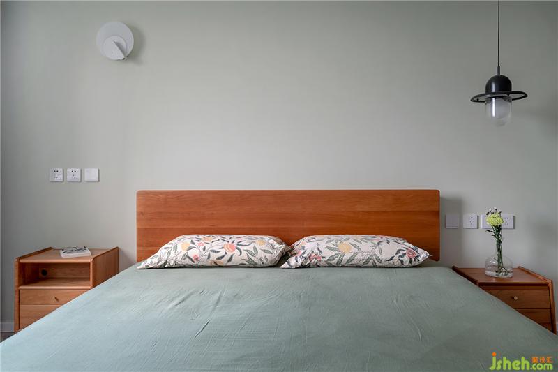 浅色的木地板通铺到卧室,灰绿色的墙面与樱桃木的床体相呼应,让整个空间更加自然。