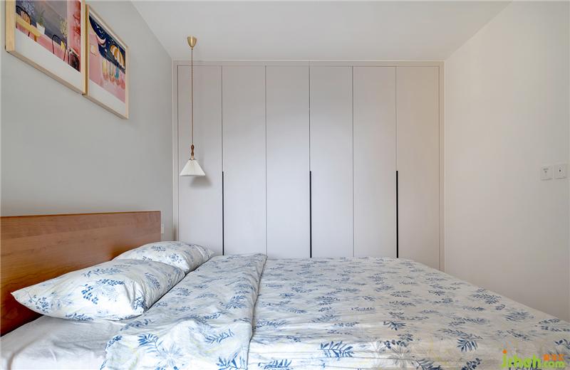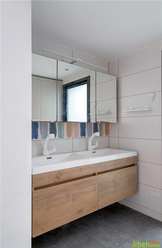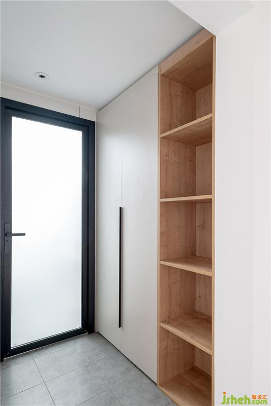 卫生间入口区域做了一组储物柜,摆放全屋的清洁用具。柜体没有全封闭,局部做了开放格,可以随意更换衣物,摆放浴巾等生活用品。