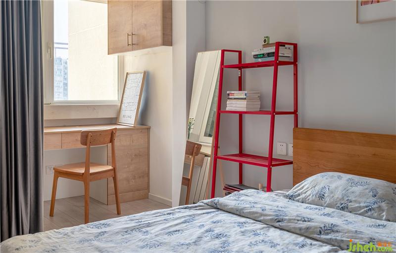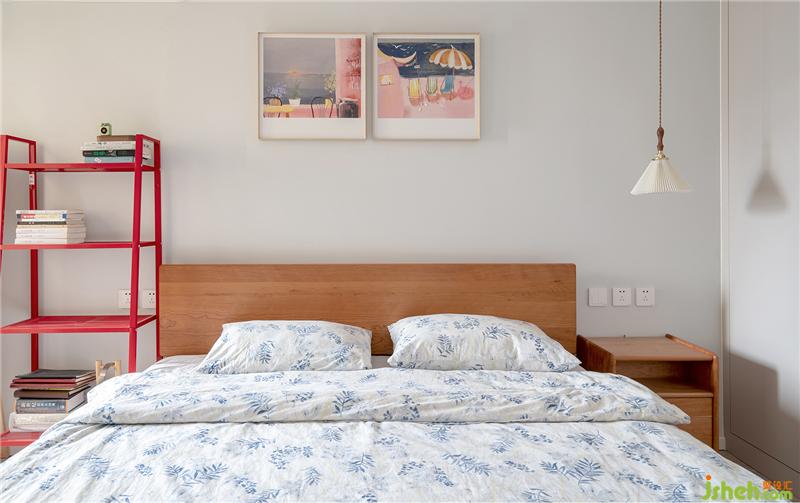 在床头摆放了一组红色的书柜,地台床头柜,还让收纳翻倍。