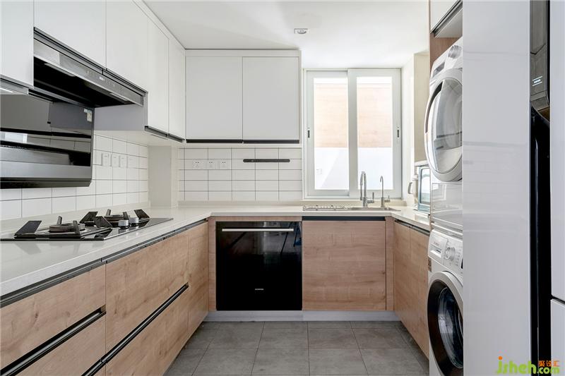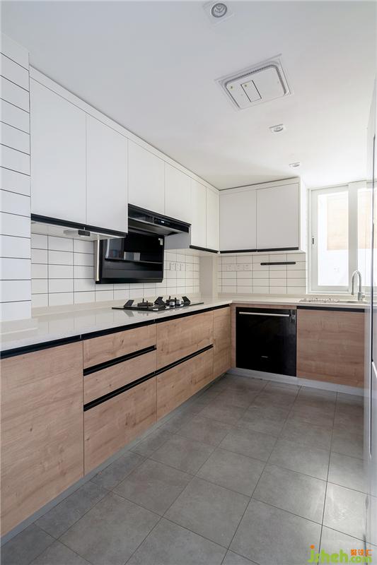 厨房墙面小白砖让整个空间更加的白净,地面深灰色瓷砖,平衡了沉稳的效果。白色的吊柜与原木底柜搭配,简单自然。