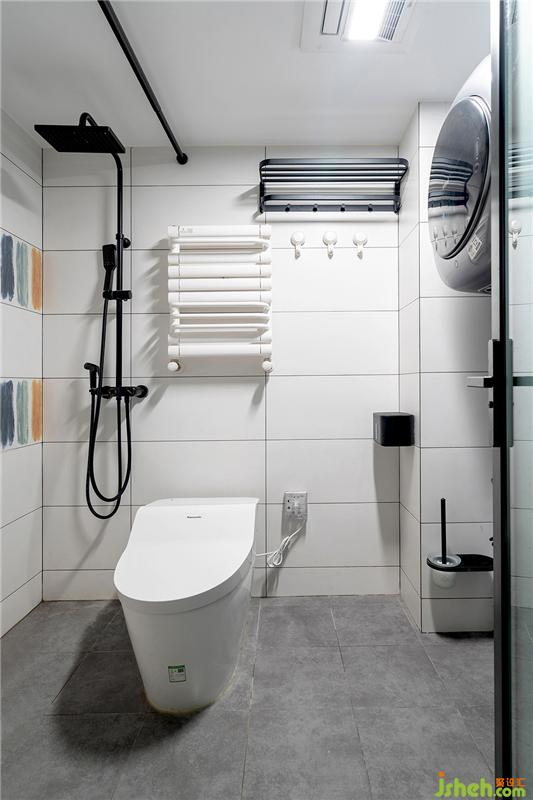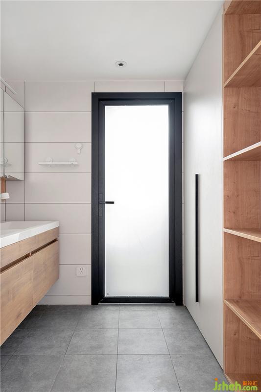 卫生间过道全景,黑色钛镁合金磨砂玻璃门,与白色瓷砖形成了黑白配。卫生间整体以简洁为主,搭配两三片花色砖提升清新质感。
