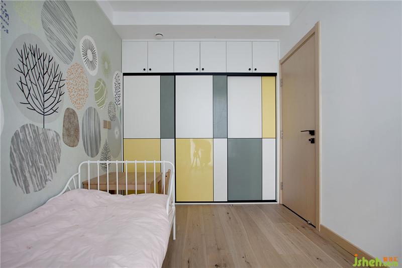 衣柜柜门用了色块拼贴的方式来制作的,这样和壁纸的色系相同,同样也调剂了小空间的沉闷。