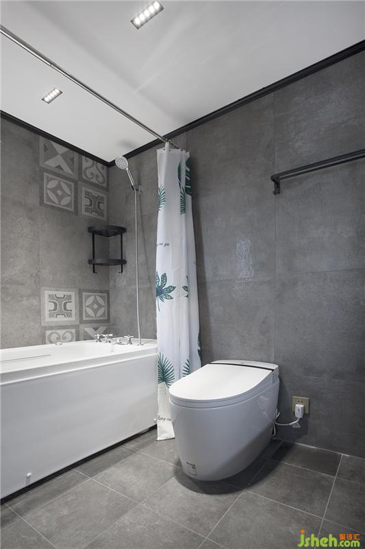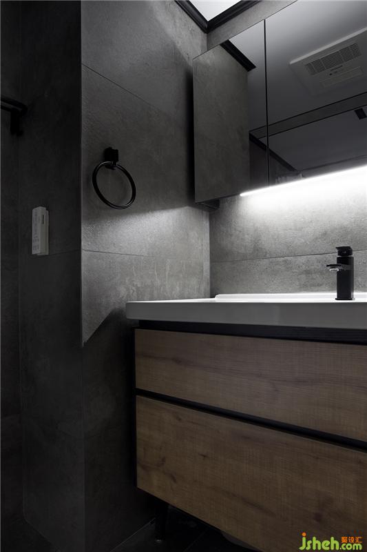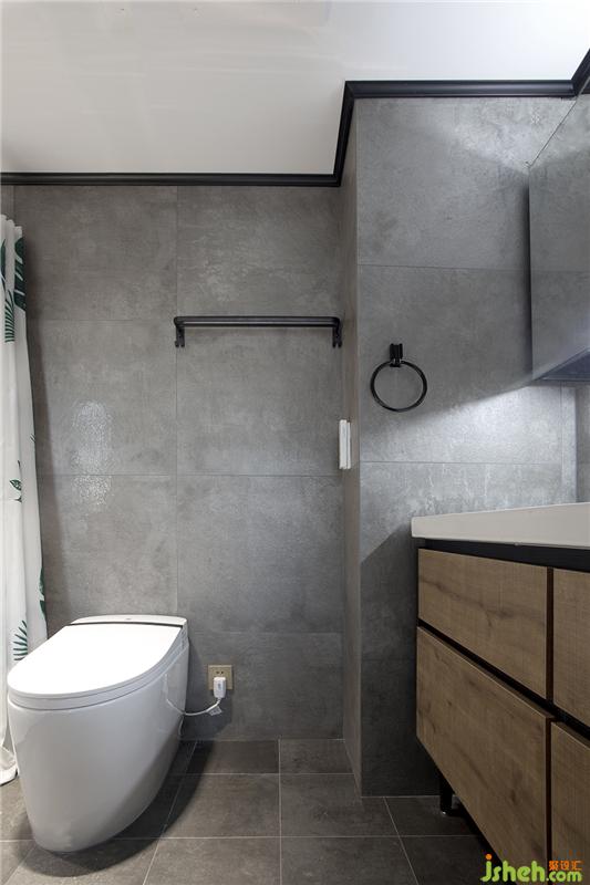 主卧的卫生间墙面直接采用了大块的水泥砖粘贴,质感更胜小块的拼贴。
