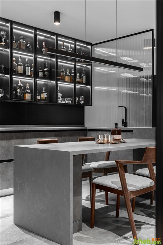 Mr.尹有很多藏酒,所以在西厨台面上方做了大量的酒架,为了便于打理安装了玻璃材质的柜门,柜内安装灯带照明,各式酒类琳琅满目,实用与美观的廉顾得以完美体现。