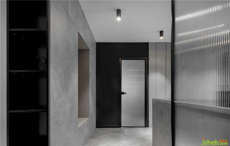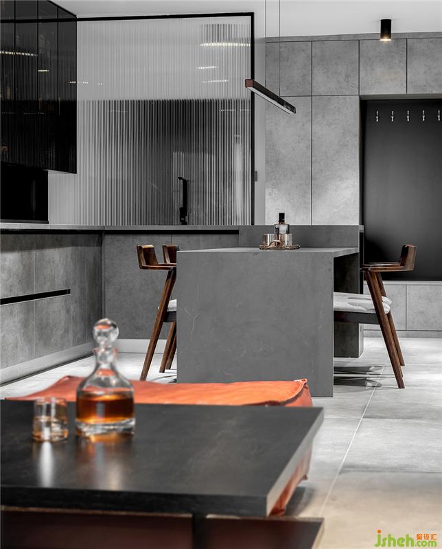 为了避免一进门对室内一目了然的突兀感,玄关区与西厨区之间由一面整高的长虹玻璃来做间隔,透过玻璃折射出屋内的光影,具有一丝神秘感。