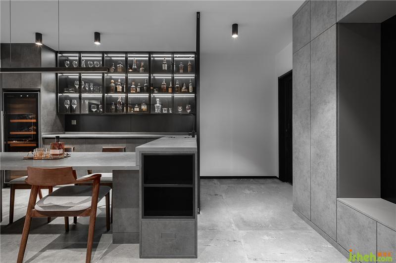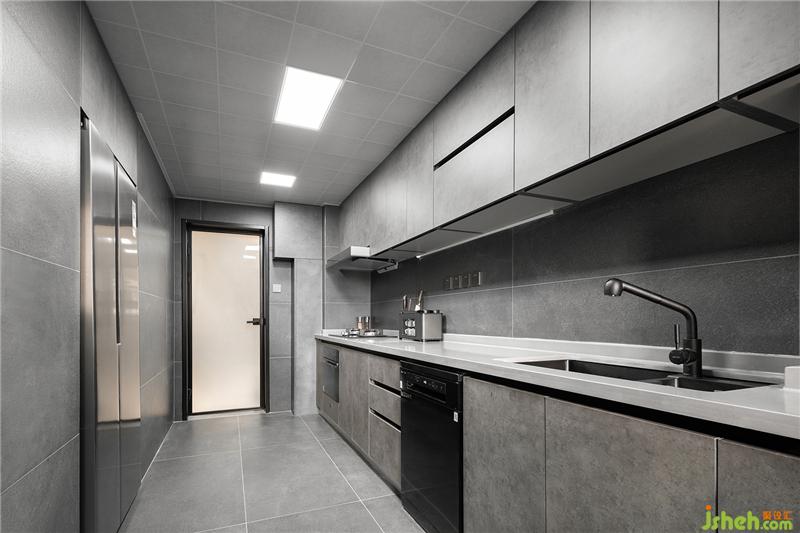 中厨区大量的底柜与吊柜具有很强的收纳能力,水泥灰色的柜门与整体风格统一。黑白灰是亘古不变的经典颜色,灵活运用连厨房也可以变得很高级。