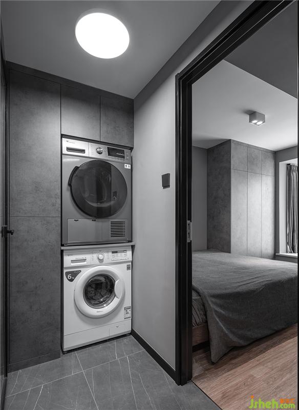 缩小原户型次卧的空间,合理运用动线在走廊尽头设计收纳柜,同时将洗衣机与烘干机镶嵌入内,空间利用率最大化,每一寸空间都不能浪费。