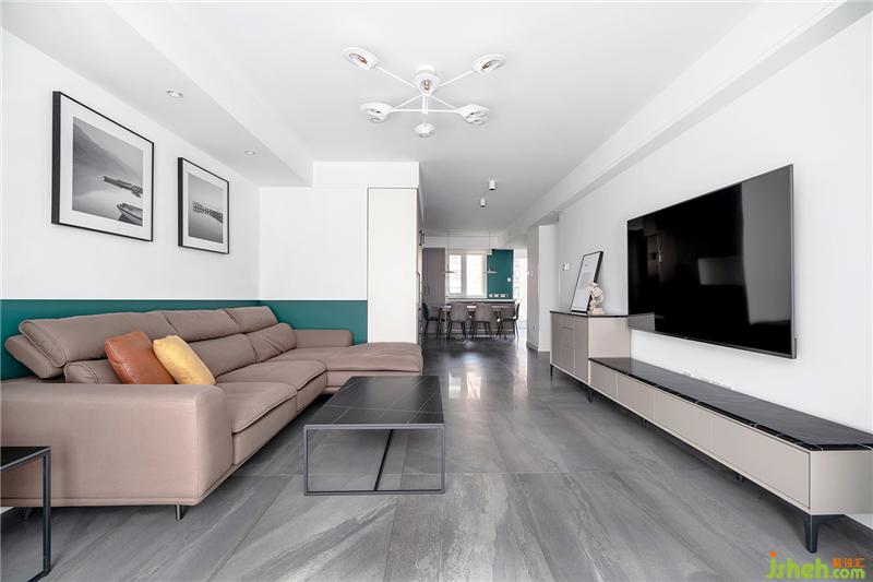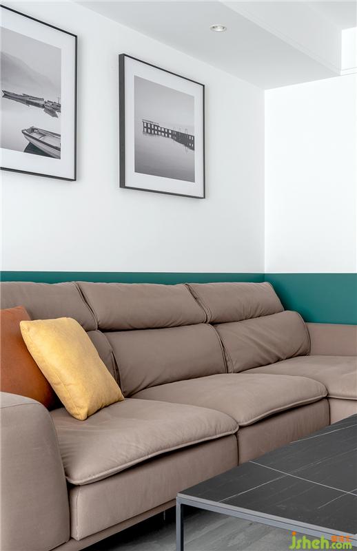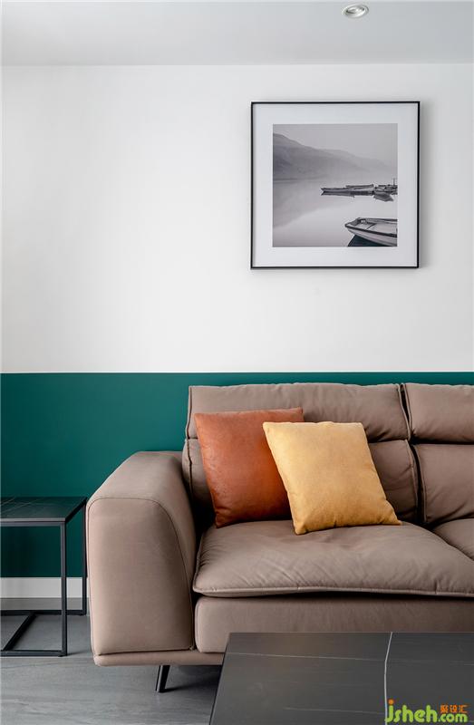 墨绿的半墙分隔,存在的意义不仅是作为空间的一个色彩点缀,同时它会在立面视觉上,把客厅背景横向加长。因为它的存在就会把一整快墙,无形中分成两个个长方形。原本简单的背景,就会增添很大的空间感。