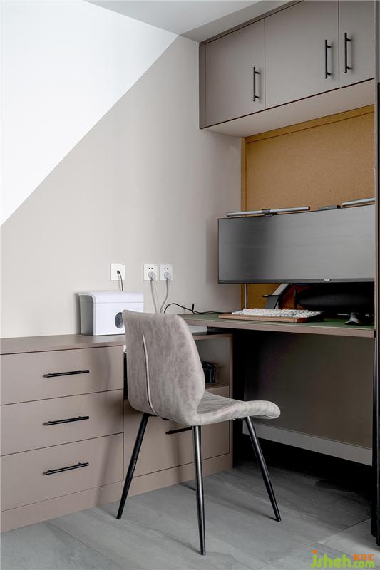 几何形状的灰色涂料,打破这个空间单椅形态,让这个办公的区域有一些创造性。电脑显示器的背后,姜黄色的区域,是一整张软木。可以随手用图钉挂一些东西,鲜明的色彩也让这个角落没有那么深沉。