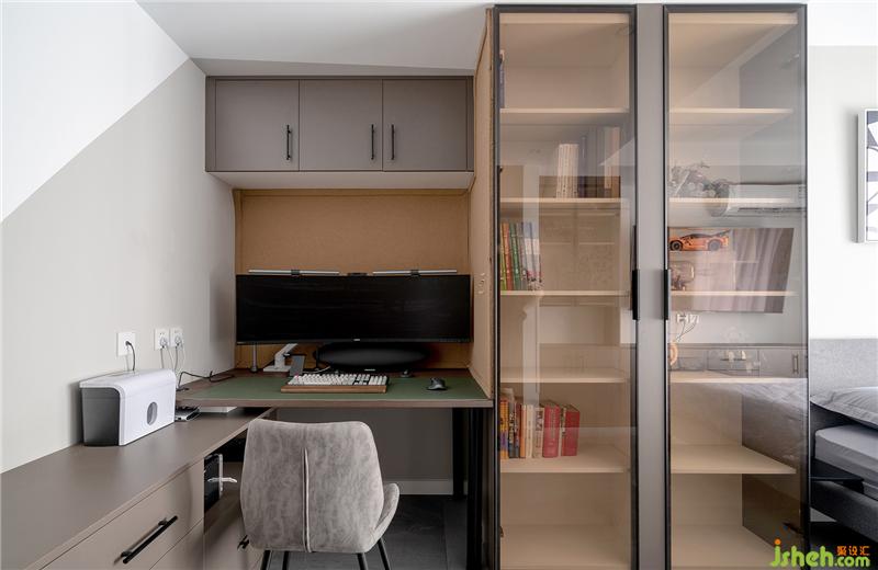 这个角度,灰色墙+软木组合,在视觉上增添些许诙谐的趣味性。