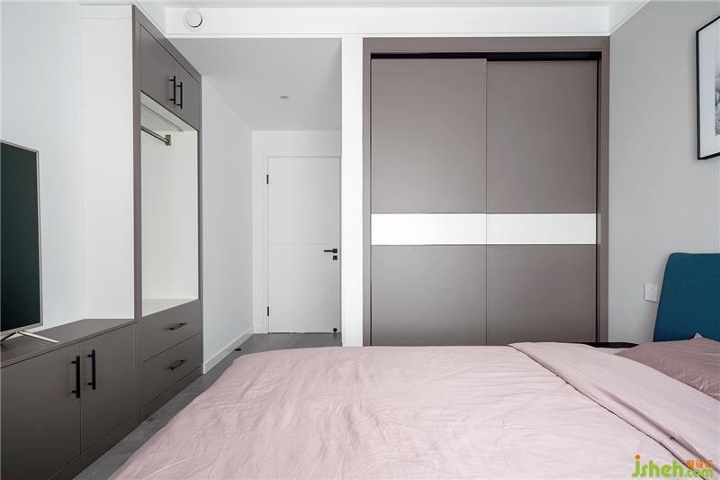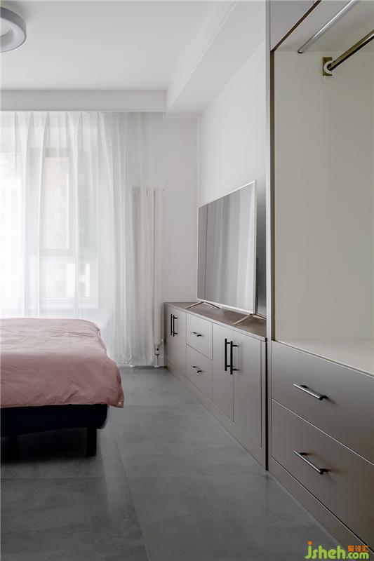 卧室的收纳设计很重要,尤其像年长的老人,都会希望卧室有可以随手挂衣的空间。所以在靠电视的这组柜子里,增加了一个挂杆,方便随手挂放一些常用衣物。