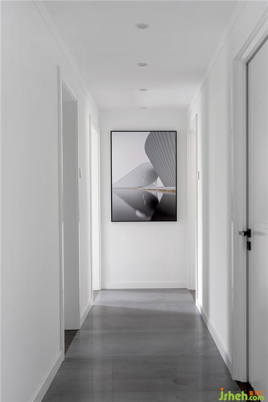 走廊作为家里每天进出的必经之地,颜值也是不必可少的。大面积的白色与不同位置的木门深浅是不同的。再配合顶面的灯光,光影效果下,这个区域产生一种空间美。配上一幅光影的建筑装饰画,整个走廊就被赋予了一种主题式的美感。