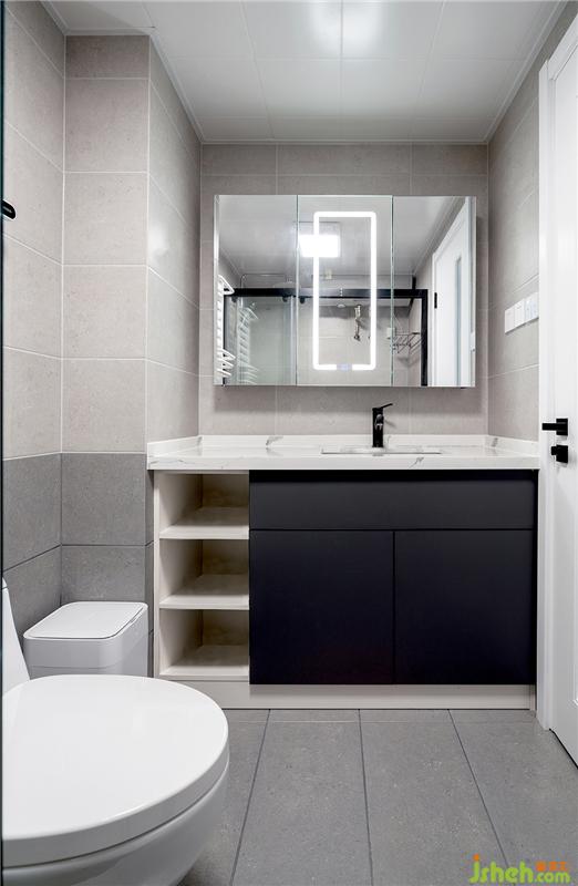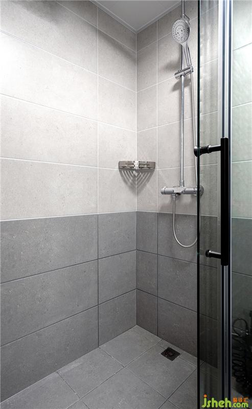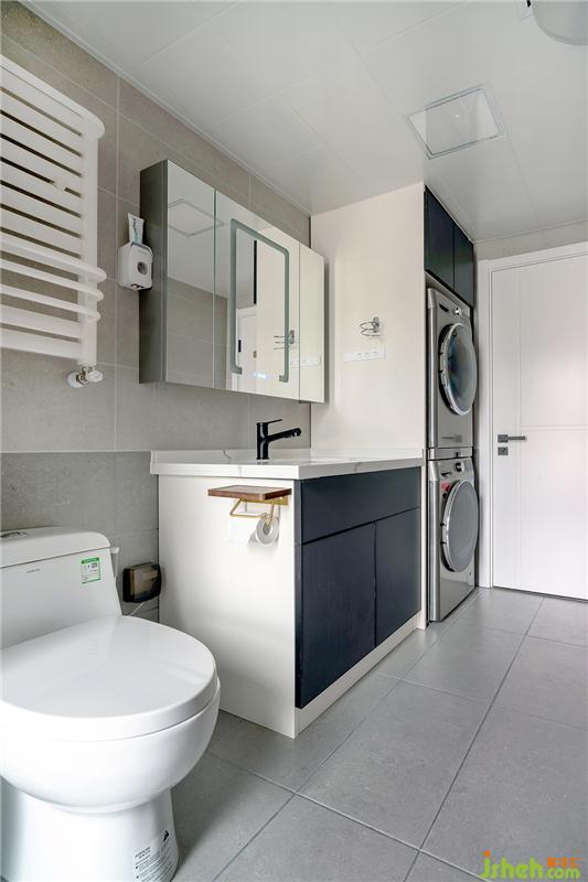 洗衣机和烘干机的上下水,电位要提前预留好,这样才能做到美观。地面是哑光灰的砂岩砖,一直蔓延到墙面半高,在视觉上也会把卫生间延伸变大。