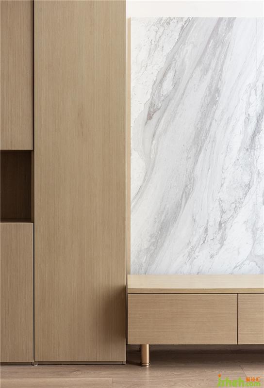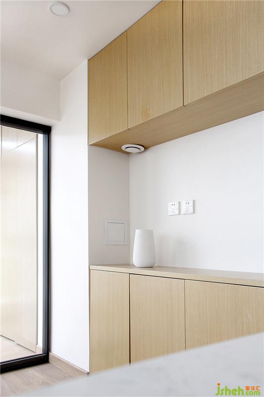 厨房吊柜中隐藏了新风设备所需要的管道,在柜体底部开孔安装通风装置,既满足了设备使用又不影响整体美观。在原厨房的管道位置预留了检修口,方便后期的故障维修。