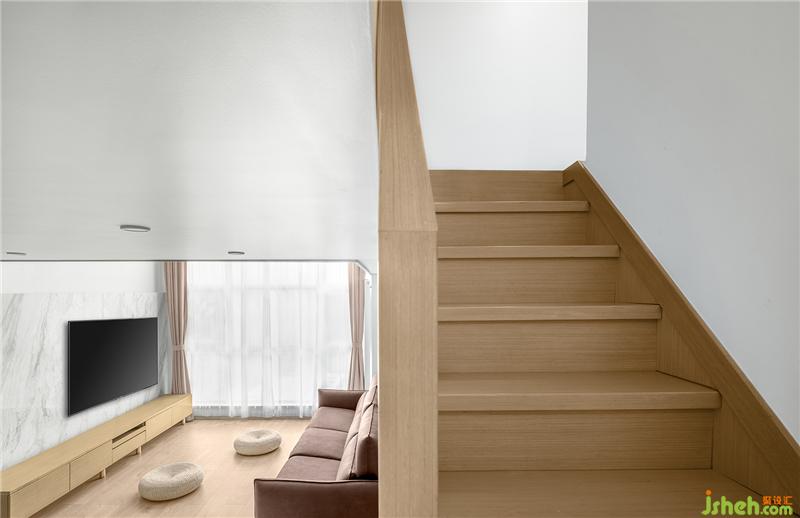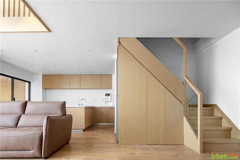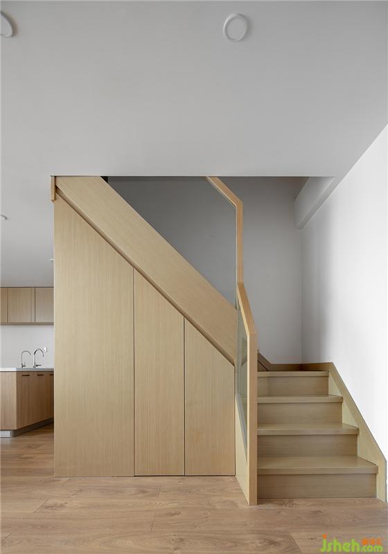 楼梯下方空间做了两组储物抽屉,增加客厅收纳功能,抽屉安装了回弹装置,不留明显把手与楼梯融为一体。