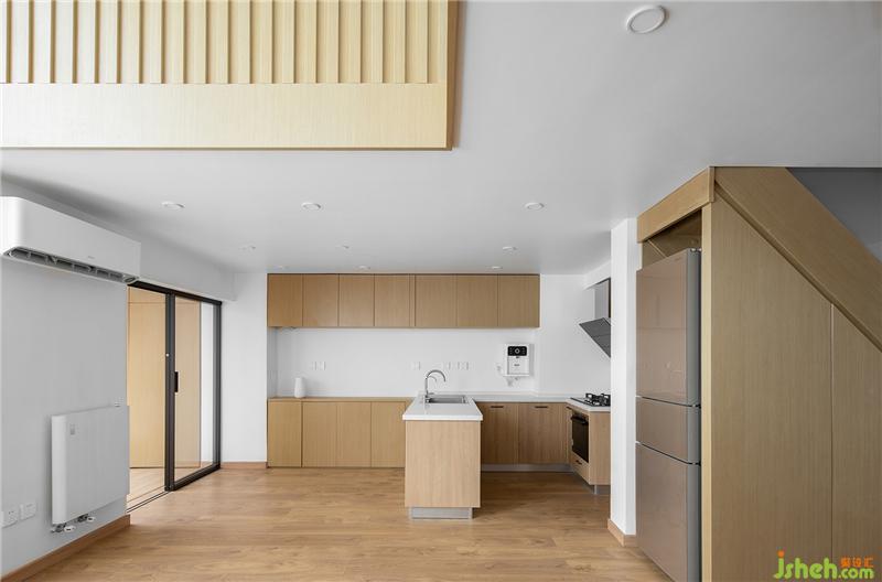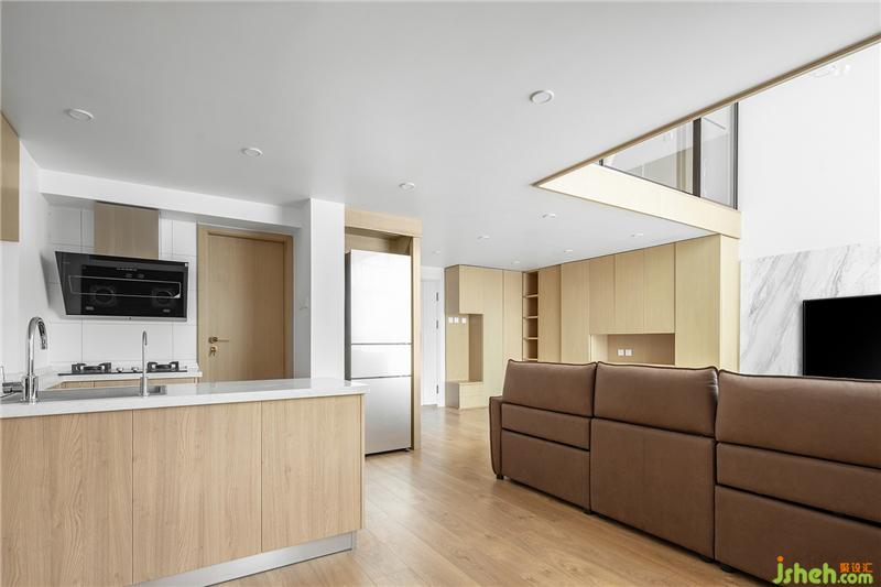 橱柜同样选择与整体风格相称的木色,T字型的开放式厨房,更合理的利用了过道空间。餐桌还在运输的路上,但已经可以想象出等安装后就餐时一家三口其乐融融温馨的场景。