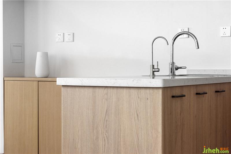 白色花纹石英石台面搭配木色柜体,清新自然。合理设计插座点位,满足多电器使用。