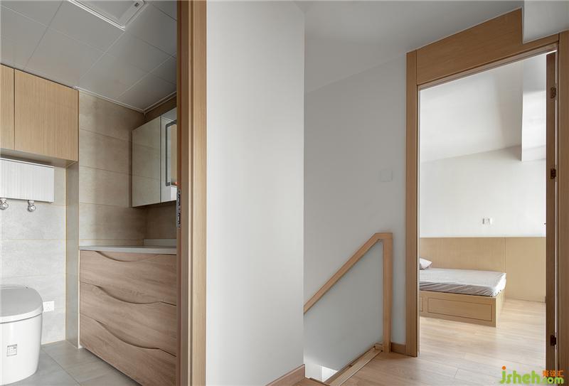 原户型中没有明确楼梯位置,我们通过改动二层卧室与卫生间之间的墙体来实现楼梯功能,虽缩减了卫生间的一些面积,但是并不影响其日常使用,何乐而不为。