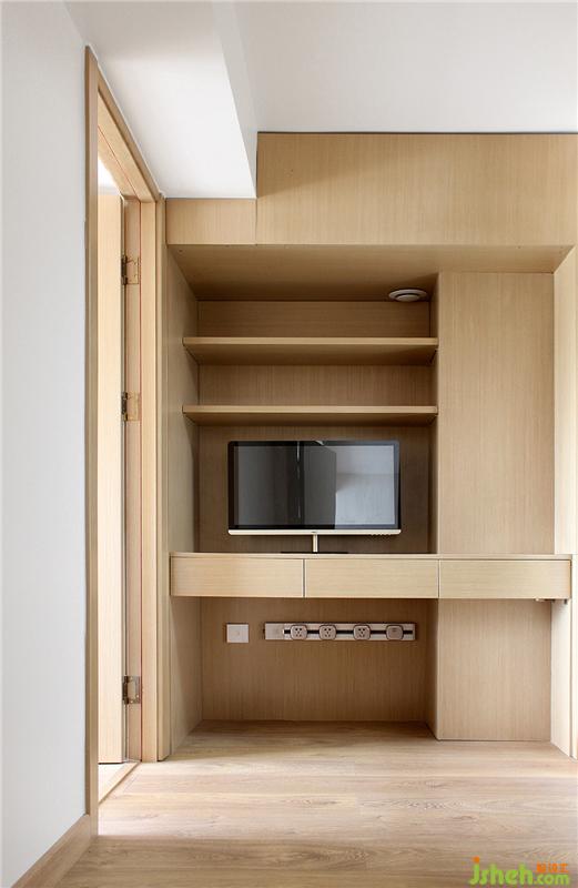 通过改动二层卧室墙体位置,利用新建墙与卫生间之间的空隙增添了办公区域,书桌下方安装轨道插座,方便使用。书架上方同样将柜体开孔,安装通风孔。
