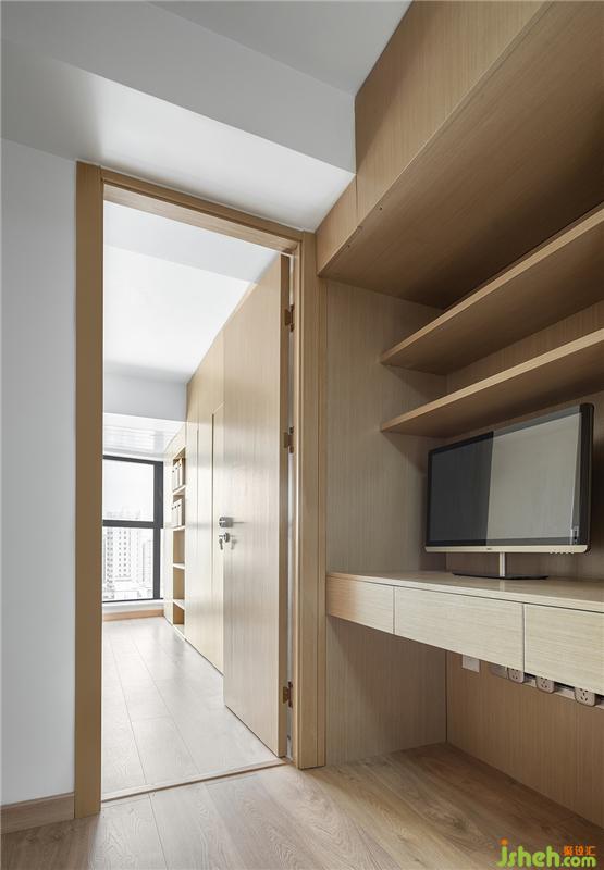 打开儿童房的门,儿童房的光线可照到走廊的办公区域,儿童房门套与书桌之间不是严词合缝,门套增加一条余量正好可以弥补这段距离,使整体变得美观。