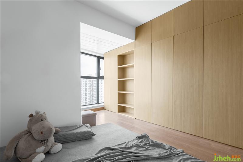 儿童房的一侧做了整面墙的收纳柜,孩子随着年龄的增长玩具、书籍、衣物会越来越多,无处摆放就会使空间变得杂乱,大量的储物柜会解决这些令人头疼的问题。