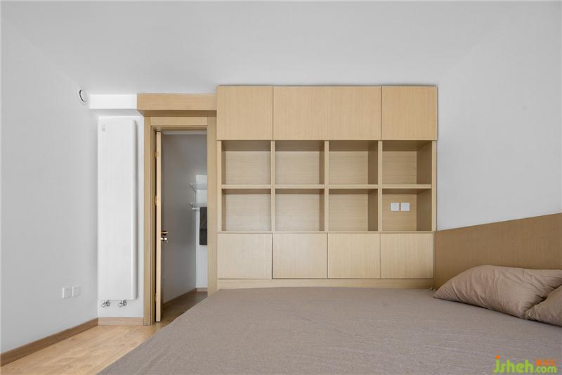 主卧中包含一间净深2550mm储物间,储物形式没有选用寻常的柜体,而是选择简单的白色铁艺框架,杂物摆放形式多样化,足以收纳夫妇二人平时的生活物品。主卧储物柜上方将空调藏入柜体中,使用时将液压杆撑起,不使用时看似一个整体,最化程度弱化空调的存在。
