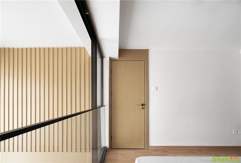 将门套做到顶,使空间更具有层次感,靠近推拉门卧室内侧安装了钢架玻璃扶手,确保日常使用安全。