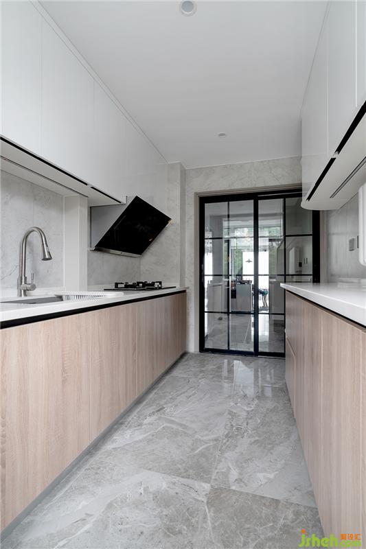 厨房的双一字型橱柜,洗切配炒集中在同一侧,且台面高度也是根据屋主的身高定制的,更能满足个人的使用习惯。