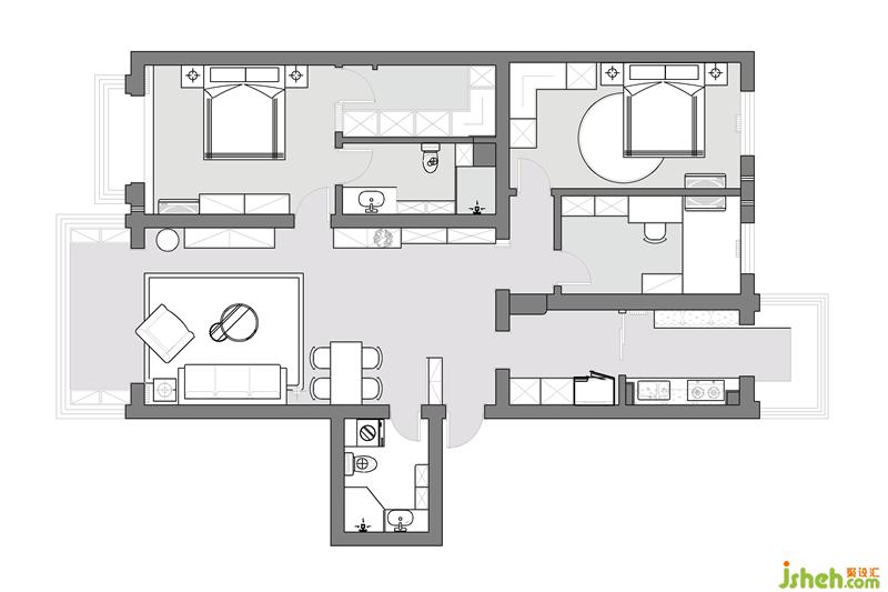 原始户型墙体基本上以承重墙体为主。户型缺点原有餐区位子在进入厨房的主要通道上影响通道的使用。客卧书房外的通道与厨房之间的洞口虽然形成了环形路线但形成了空间的浪费。