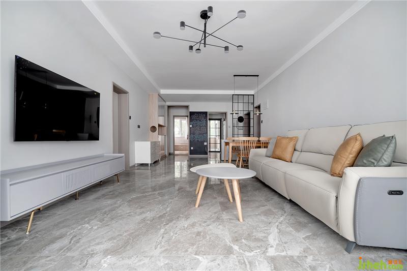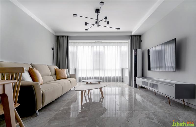 客厅区域灰色地砖饰面墙面颜色立邦漆(太空漫步),窗帘布艺为抹茶绿,客厅沙发芝华士头等舱材质为(科技布)防止猫咪抓挠,整体没有太多的装饰。