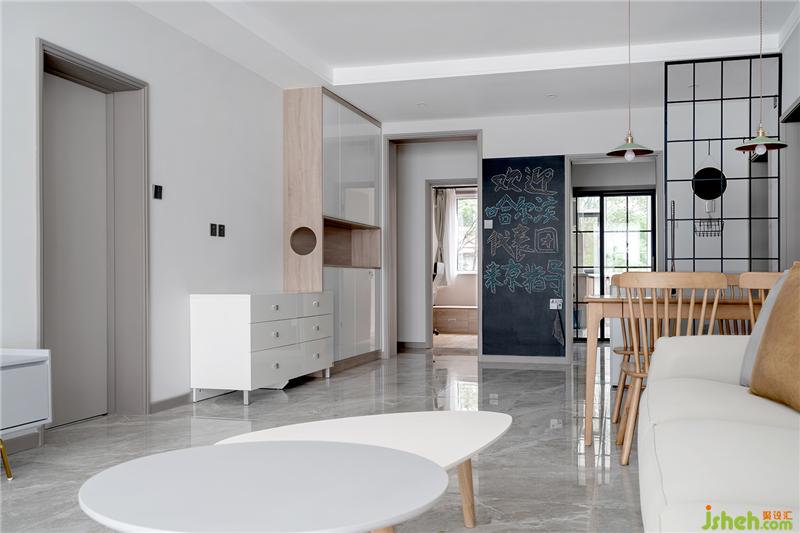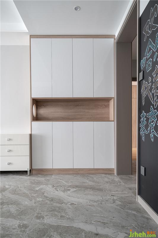 玄关对面做了换季的鞋柜以及猫咪的活动区域,在卧室通道以及厨房入口之间的墙体贴了黑板墙贴。