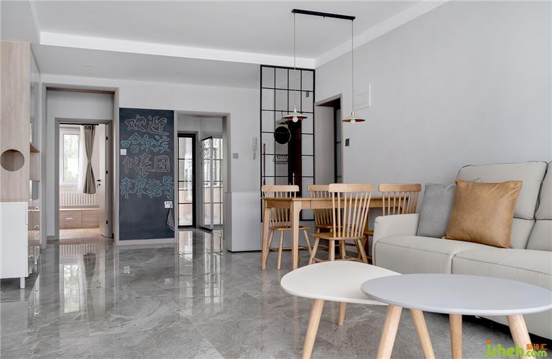 从客厅看向餐厅,进门左手边是换鞋凳和收纳柜,主要方便收取快递等物件临时存放,在收纳柜上方是十字格配上挂钩回家后的包包以及钥匙可以挂上在这里。
