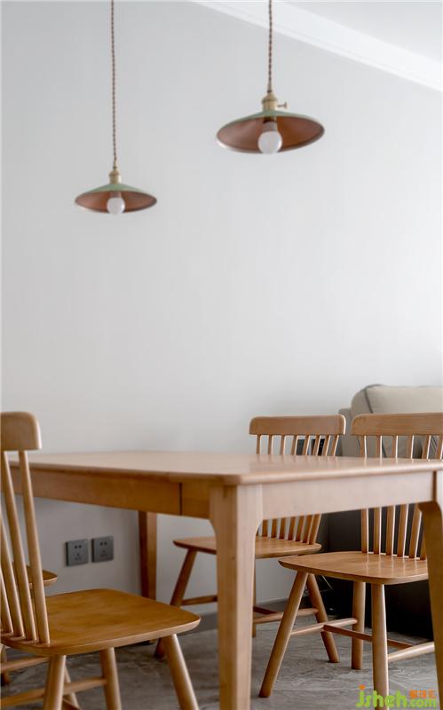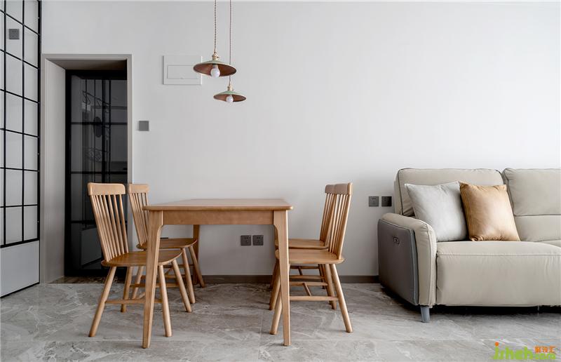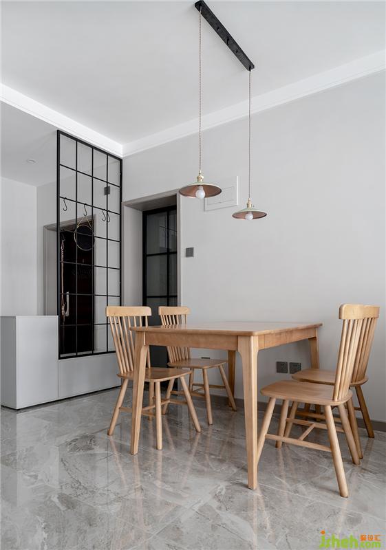 餐桌往左走分别是次卫卫生间门玄关区域换鞋凳。黑色金属十字格,灰色换鞋凳,木色餐桌,以及带有复古元素的灯具构成了餐厅的一角。
