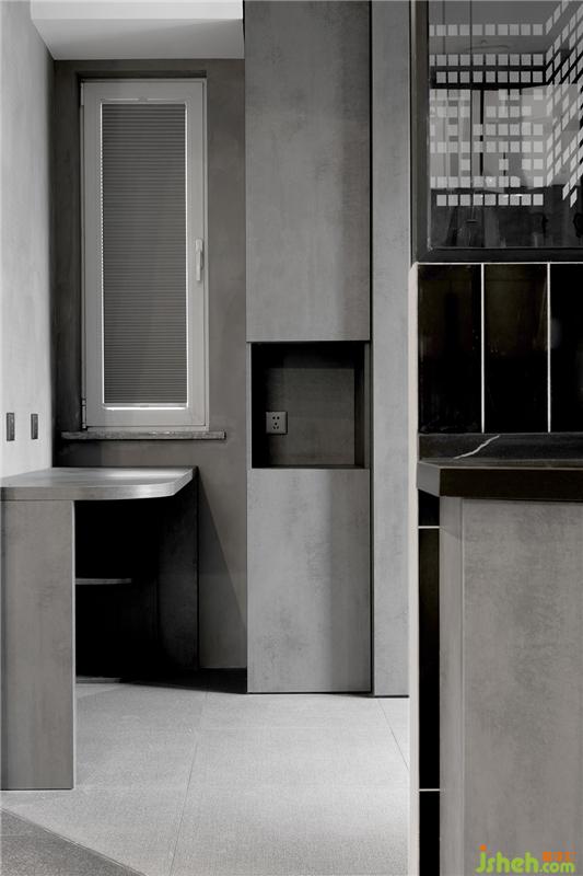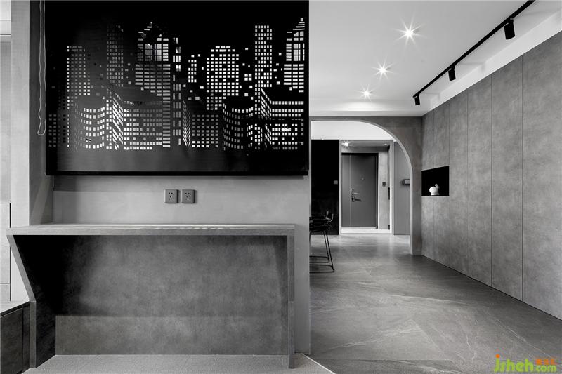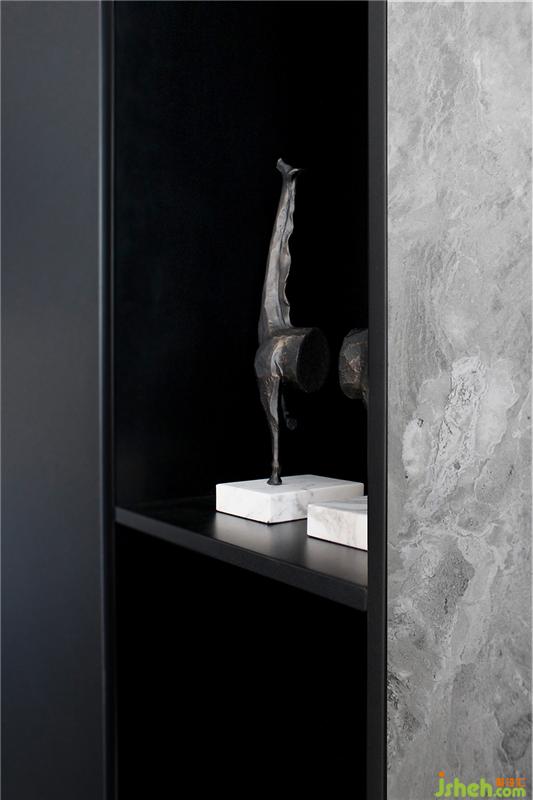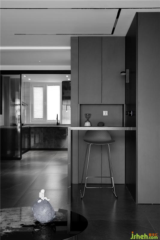 吧台后方利用墙体做了到顶的收纳柜,中间留空部分可放置一些小摆件,储物功能多样化。石材吧台与哑光石材地面反射出的光影给人带来一丝高冷的气息。