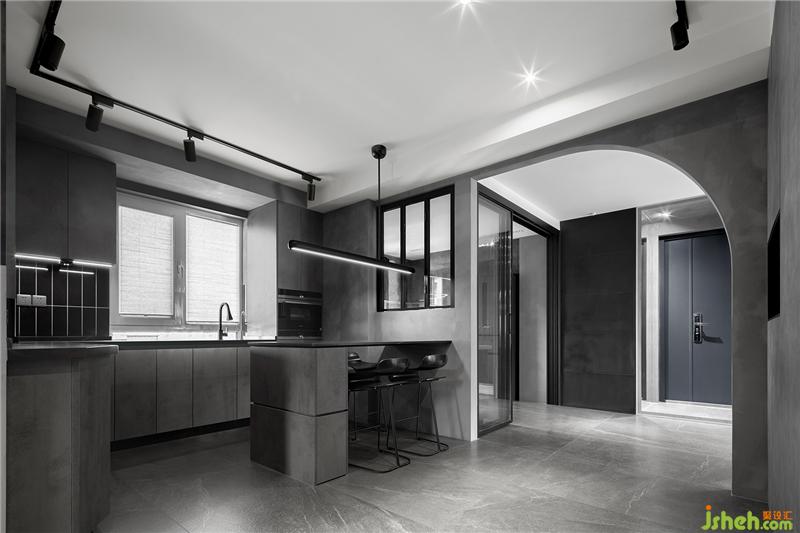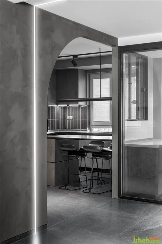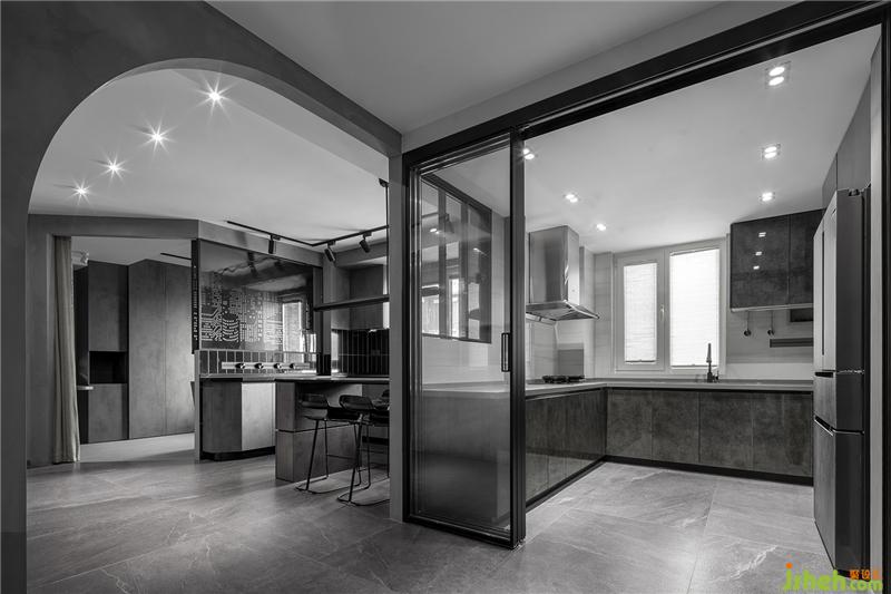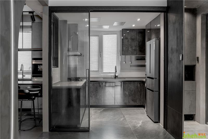将原户型中厨朝向客厅的墙体拆除,向外延伸空间面积并用玻璃推拉门做隔断,不仅扩大了中厨操作台面积而且使内部采光更通透。