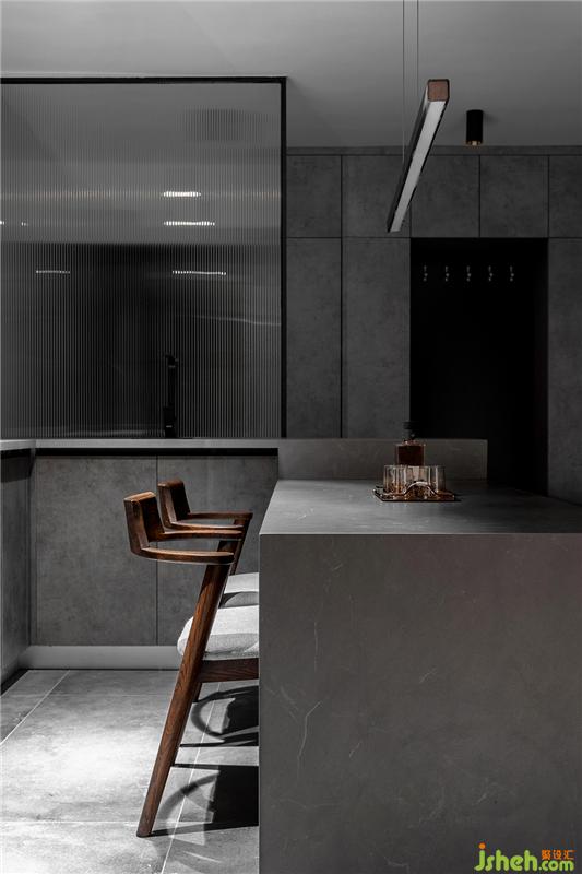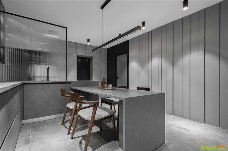 餐厅区域利用过道空间设计一处西厨区,与就餐岛台融为一体,洄游动线让空间交通无阻碍。