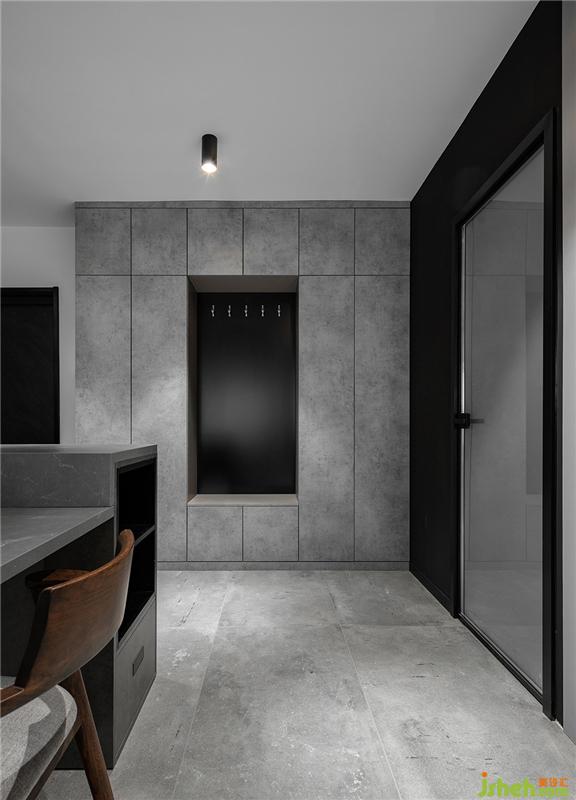 中厨区大量的底柜与吊柜具有很强的收纳能力,水泥灰色的柜门与整体风格统一。黑白灰是亘古不变的经典颜色,灵活运用连厨房也可以变得很高级。