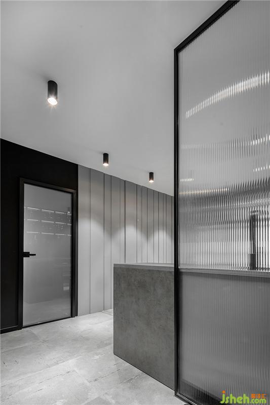 书房与主卧同样选用无主灯设计,筒灯照射出色温3000k的柔和的光线更适于工作与休息。黑色踢脚线与浅灰色墙面形成鲜明对比。