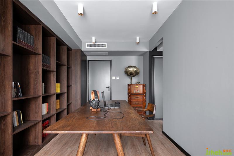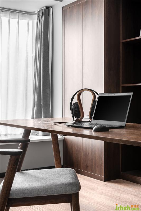 书房区域一侧做了整面墙深胡桃木色收纳柜,中间部分定制为开放格书架,使业主收藏的大量书籍得以摆放。