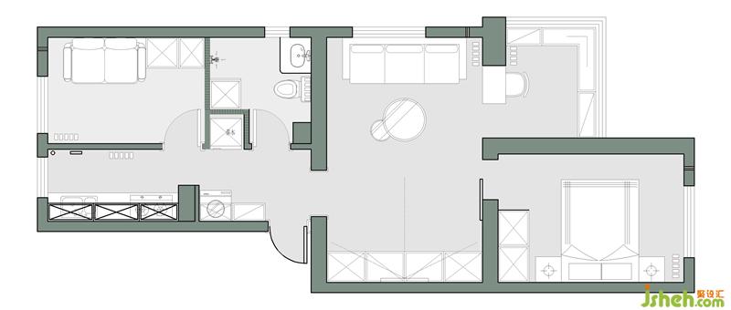 把次卧与卫生间之间的隔墙,向次卧方向改动。扩大了卫生间的面积,增加了卫生间的淋浴区。在这个基础上,把厨房中的冰箱解放出来,内嵌到墙体里。去掉阳台的门连窗增加客厅的使用面积。