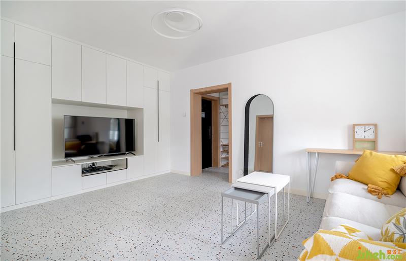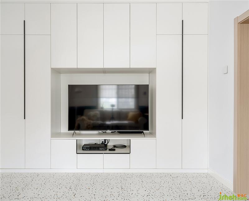 利用客厅的进深在沙发对面增加了一组储物柜体,增加全屋的储物空间。原先是考虑幕布投影做整体柜体,考虑到老人所以选择牺牲一部分储物电视内嵌。地面选择的是水磨石,踢脚线选择的是实木乳白色踢脚。窗套是采用的是和门套垭口一样的材质木色贴皮。