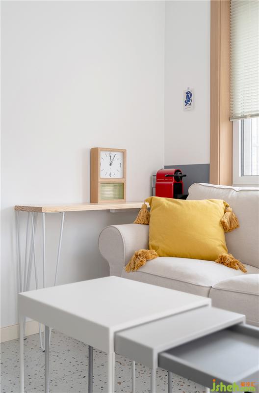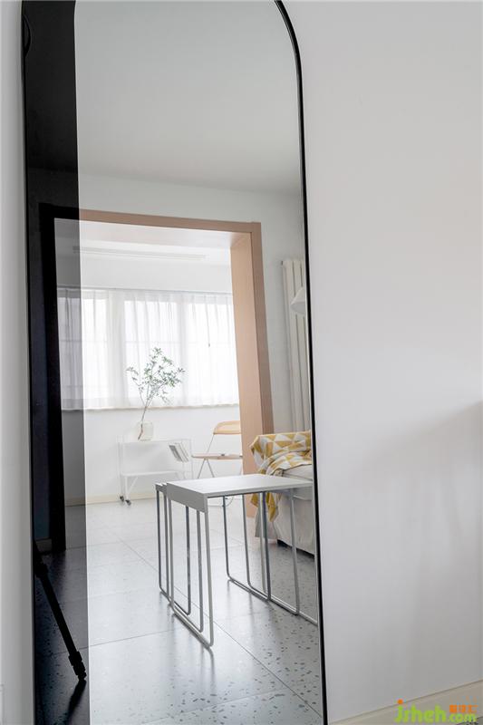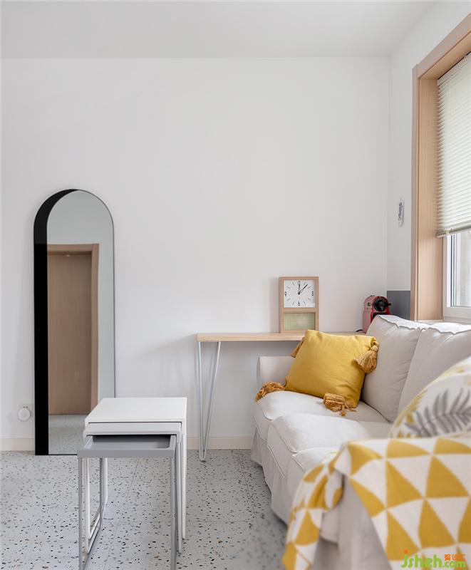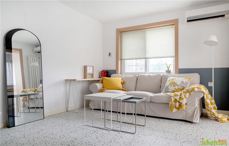 沙发茶几都是宜家款,茶几可以伸缩想平时只有业主的时候可以做为临时餐桌使用,拱门造型的镜子使空间更有趣味感。