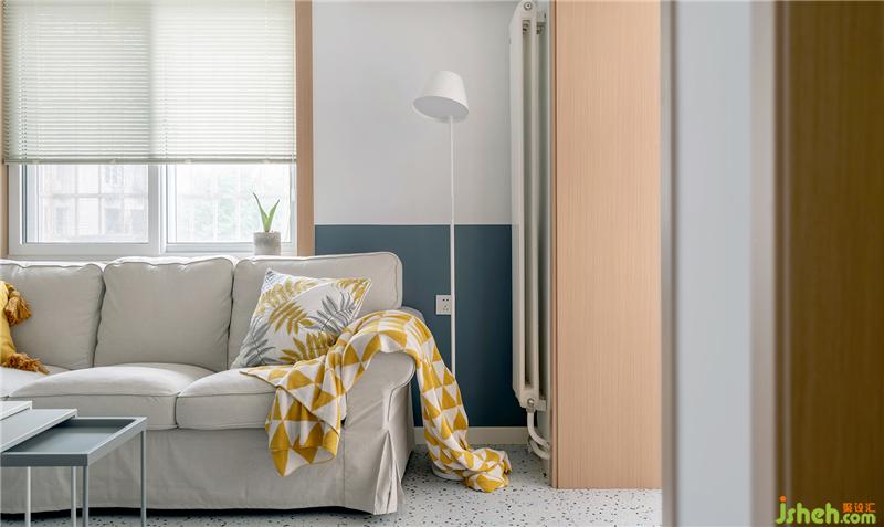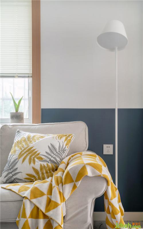 沙发一角黄色的挂毯与抱枕颜色相呼应,背后的上下墙与落地灯来凸显沙发的质感。