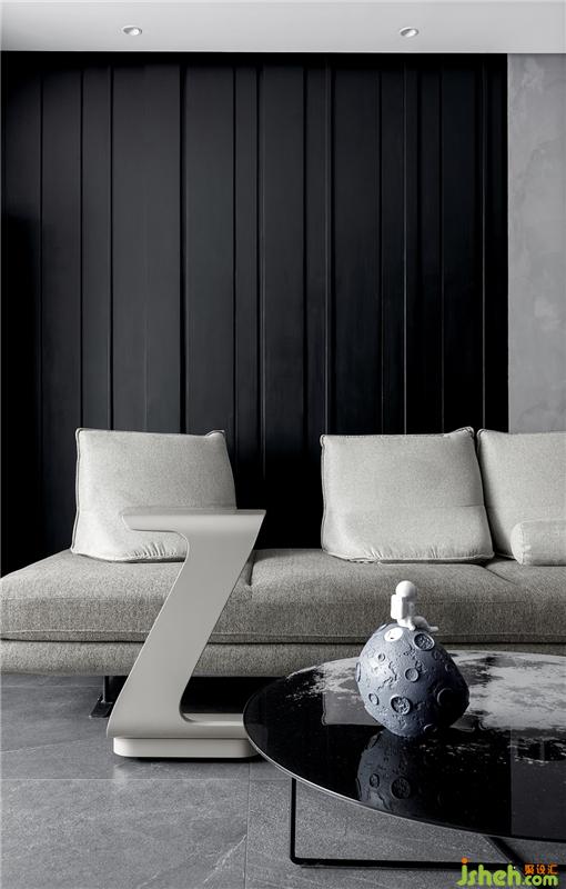 客厅边角的站立吧台巧妙的利用空间,让屋主在家中有更多种活动形式。吧台材质选用了石材,坚硬耐磨,台面落地更巩固其稳定性,黑色纹路充满质感。